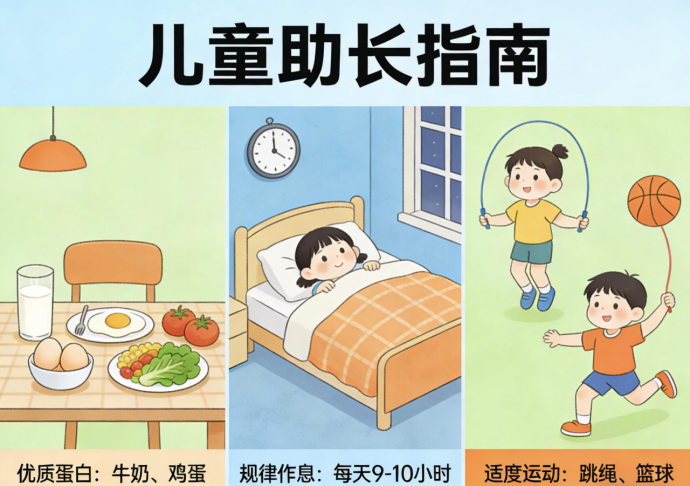 结合孩子生理特点,推荐跳绳、游泳、摸高跳、户外跑等纵向拉伸运动,配合阳光照射,促进骨骼生长与钙质吸收。运动强度与时间需科学安排,避免过度疲劳。