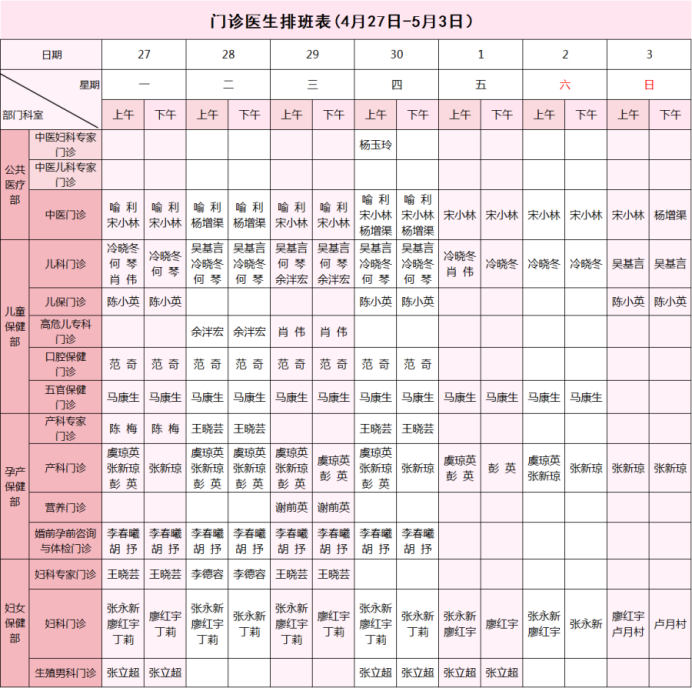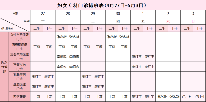 【4月27日-5月3日】荣县妇幼保健院门诊医生坐诊安排表