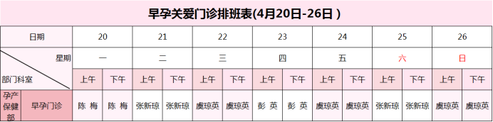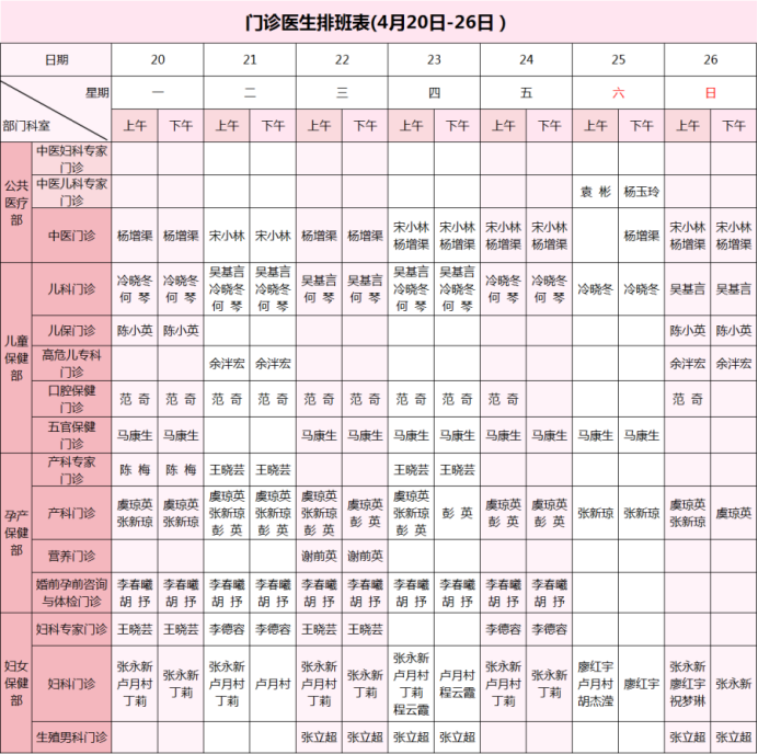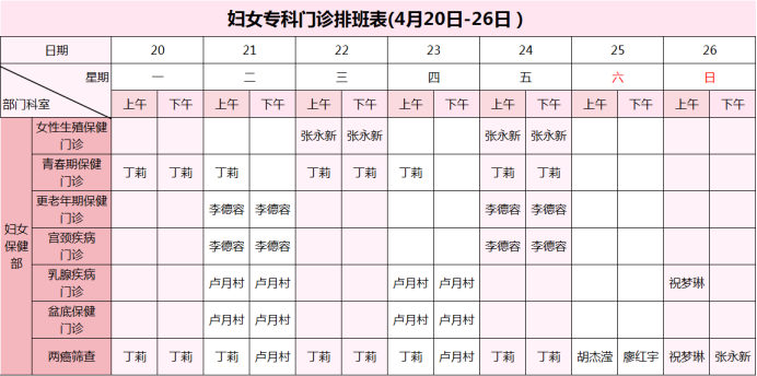 【4月20日-4月26日】荣县妇幼保健院门诊医生坐诊安排表