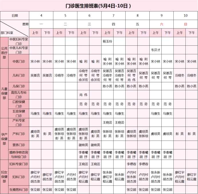 【5月4日-5月10日】荣县妇幼保健院门诊医生坐诊安排表